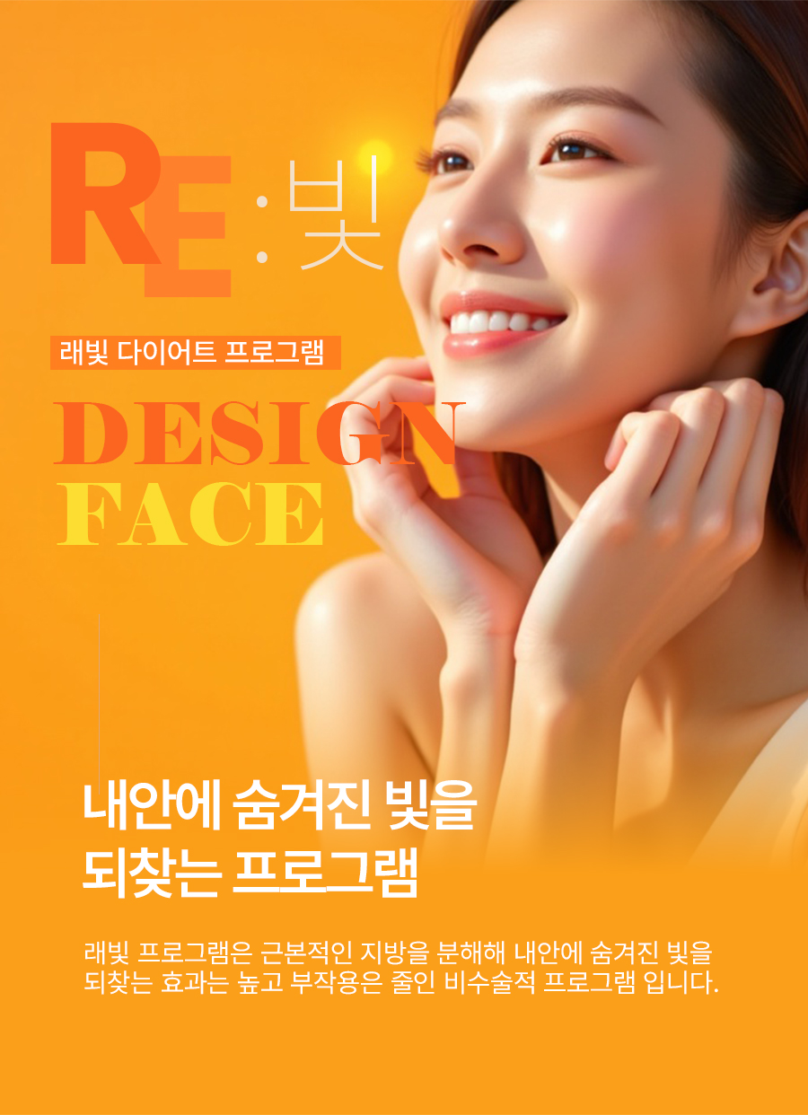 노력과 시간을 반으로 줄이고 내안에 숨겨진 빛을 되찾는 투앤티의원만의 노하우가 집결된 '디자인 페이스 래빛' 다이어트 프로그램 입니다.
