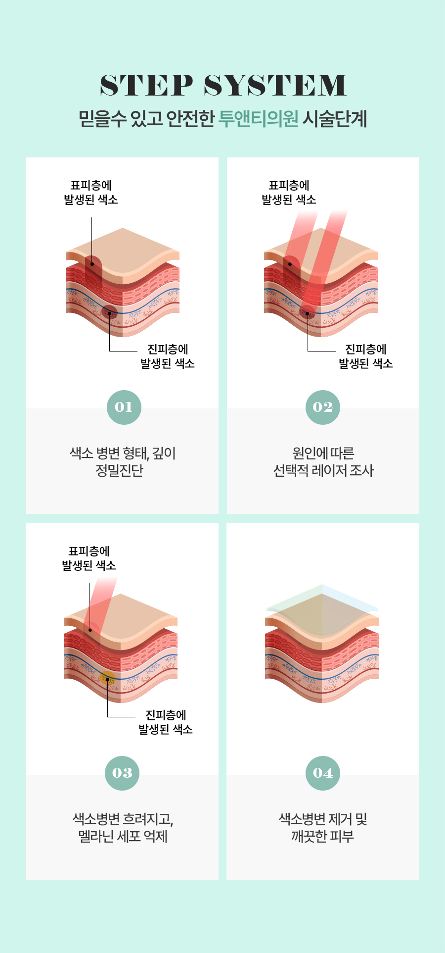 기존 나노세컨드보다 1,000배 빠른 피코세컨드 속도로, 각종 색소 병변 치료에 탁월하며 높은 시술 효과와 적은 부작용을 자랑합니다.